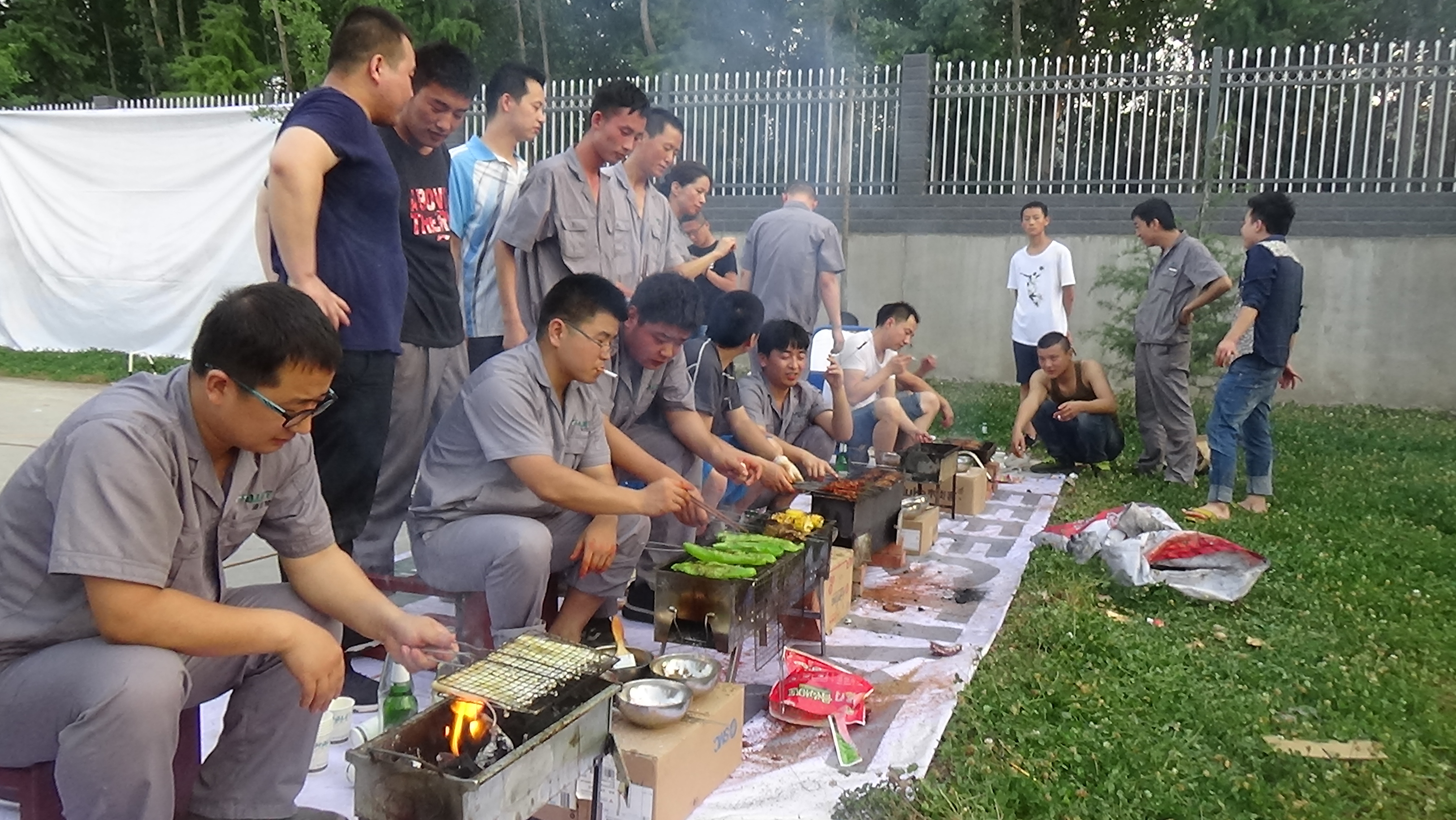 到處都是大家忙碌的身影,下午6點時刻,大家已紛紛到達燒烤節場地,不一會兒,會場中炊煙裊裊,烤爐的火剛生好,大伙兒已經迫不及待地圍在烤爐邊,將早已串好的食物放到爐上,整個燒烤場地飄逸著烤肉的香味,不太擅燒烤的同事,紛紛交談起來,享受著美酒和美食。大家不時的舉起酒杯,或是閑聊,或是祝福,或是開懷大笑,一片熱鬧的景象。整個燒烤節一直持續了3個多小時,燒烤孜然的聲音,歌聲,碰杯的聲音,歡笑聲交織在一起,不絕于耳。